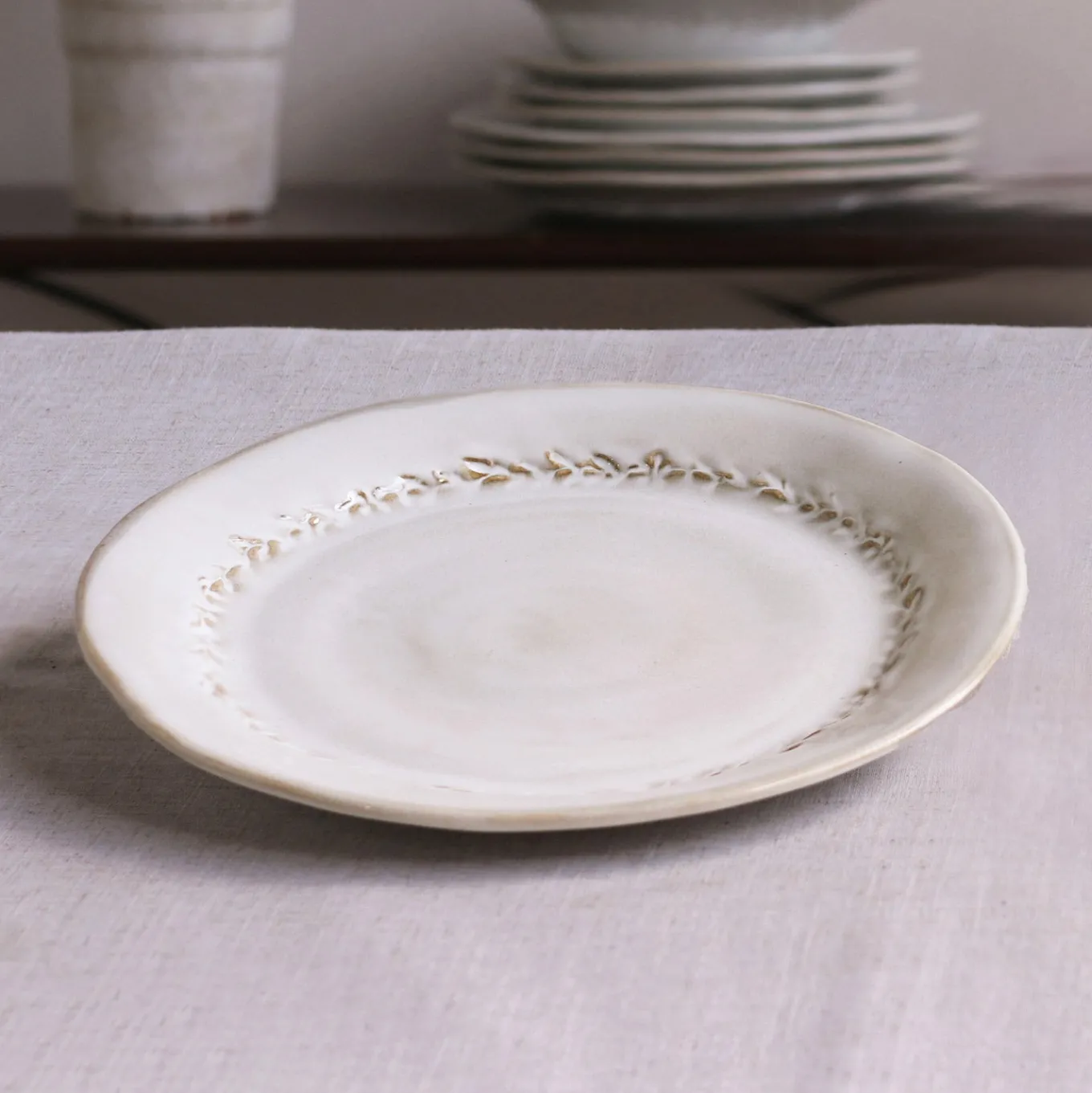 It might take a lifetime to assemble a ceramic collection such as this.Beatriz Ball searched the globe to put together this irresistible selection for you. Using one-at-a-time hand glazing techniques meticulously performed by the skilled artisans of Portugal, our new Allegra, Aurora, Chiara, and Valentina ceramic items showcase a lively interplay of color and surface irregularities that guarantees their uniqueness. CERAMIC Valentina Dinner Plate Set of 4 (Dusty White) is a great example, and a testament that no two pieces are ever alike. Adorned with an etched wreath design, the Valentina plate is as versatile as its 11″ shape is generous. Its richly irregular surface spotlights the art of hand glazing, while its form demonstrates the timeless appeal and durability of fired stoneware.Pair with CERAMIC Valentina Soup Bowls and Salad Plates in Dusty White, or mix with Valentina items in Green, or Allegra, Aurora or Chiara designs in either color. Designed to mix and match.Sold as a set of four, the stoneware dinnerware pieces are handmade and skillfully glazed.Microwave, dishwasher and oven safe up to 350 degrees.