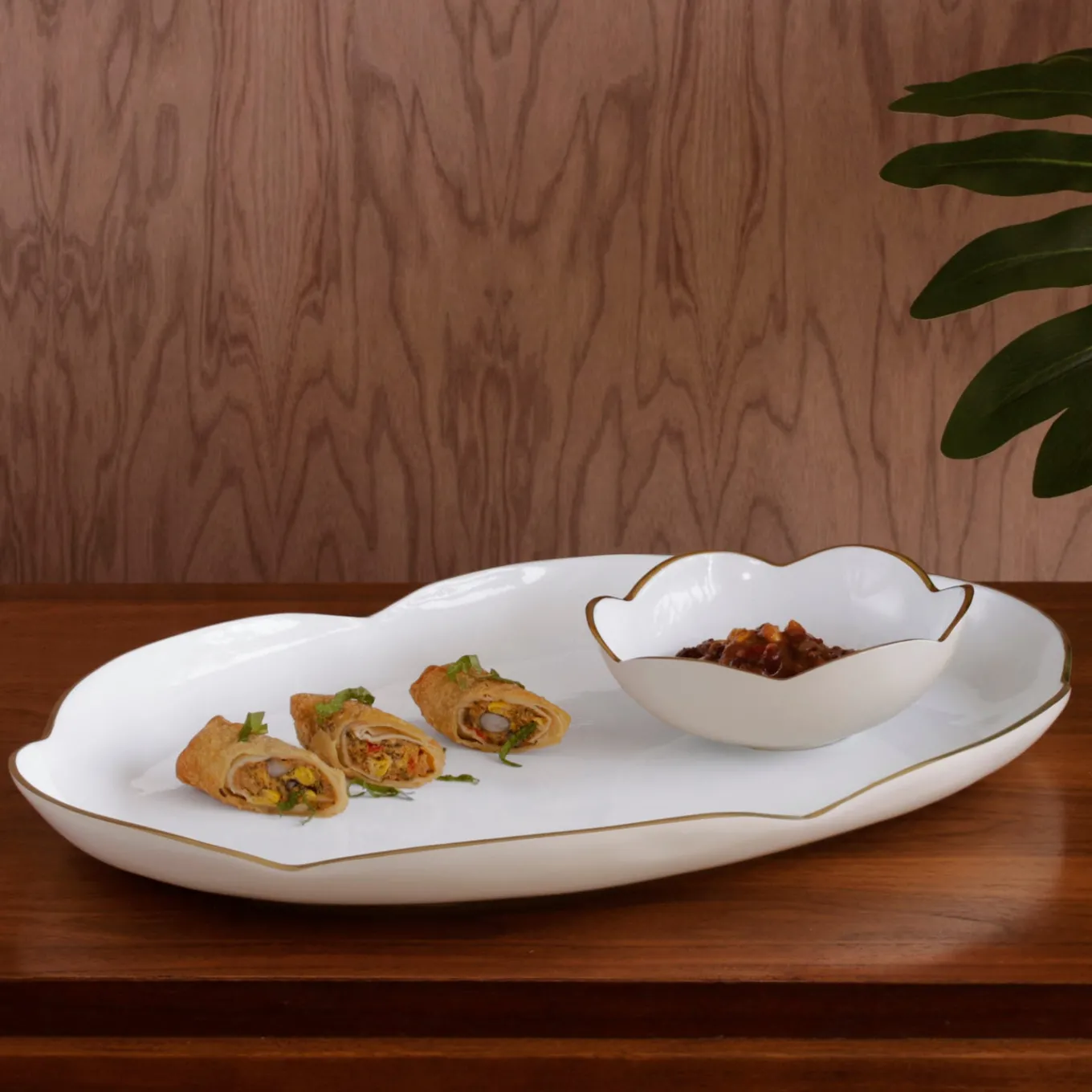 Timeless and versatile, the ENCANTO Amelia Pedestal Cake Plate in Cream and White makes a stunning centerpiece. With its curving silhouette, luminous gold-tone accents, and neutral cream finish, it’s perfect for displaying cakes, mini desserts, or savory bites—and a beautiful decorative accessory on the table or sideboard.
