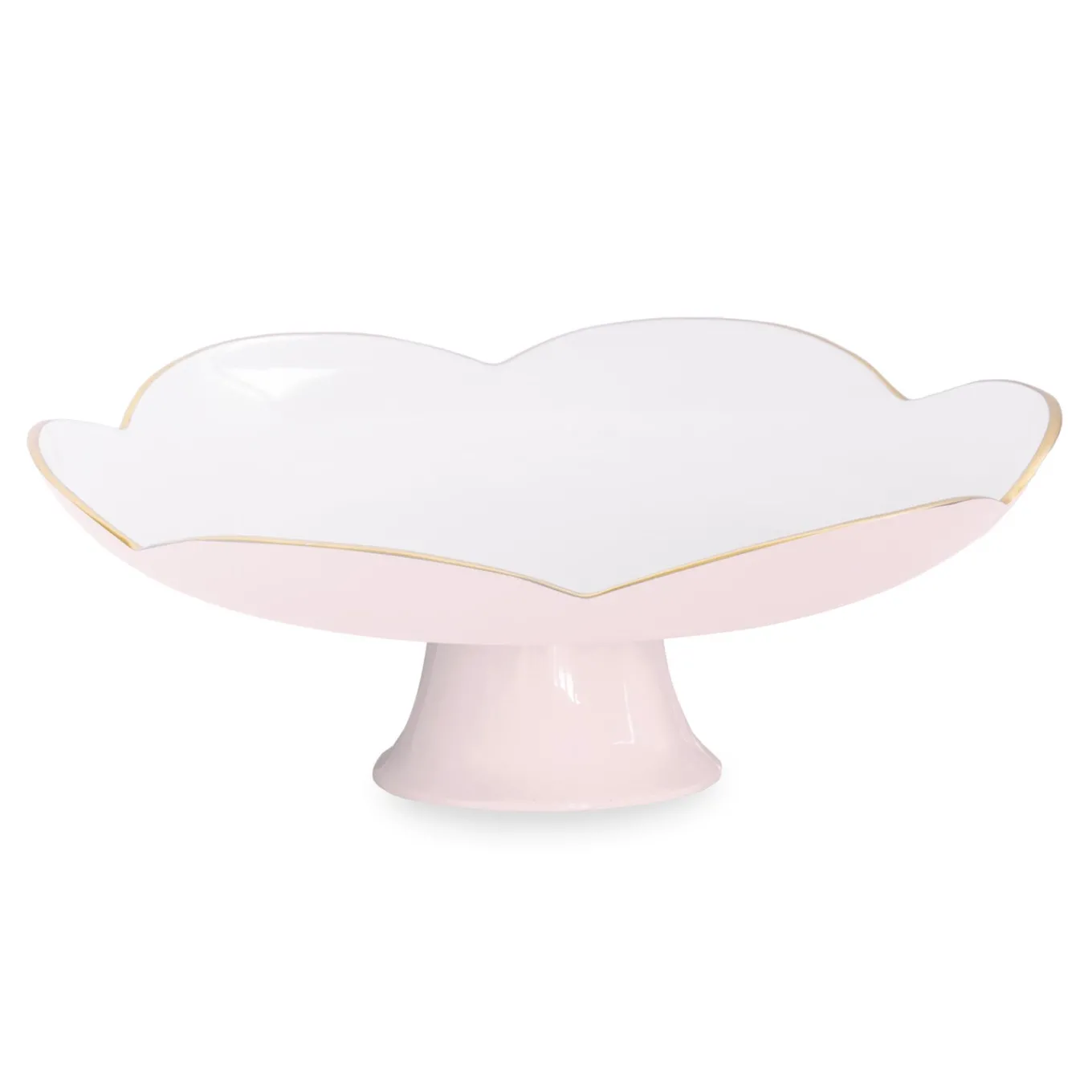 Bring a soft blush accent to cakes, mini desserts, or snacks with the ENCANTO Amelia Pedestal Cake Plate in Camellia and White—romantic color, fluted form, and gleaming gold-tone rim.