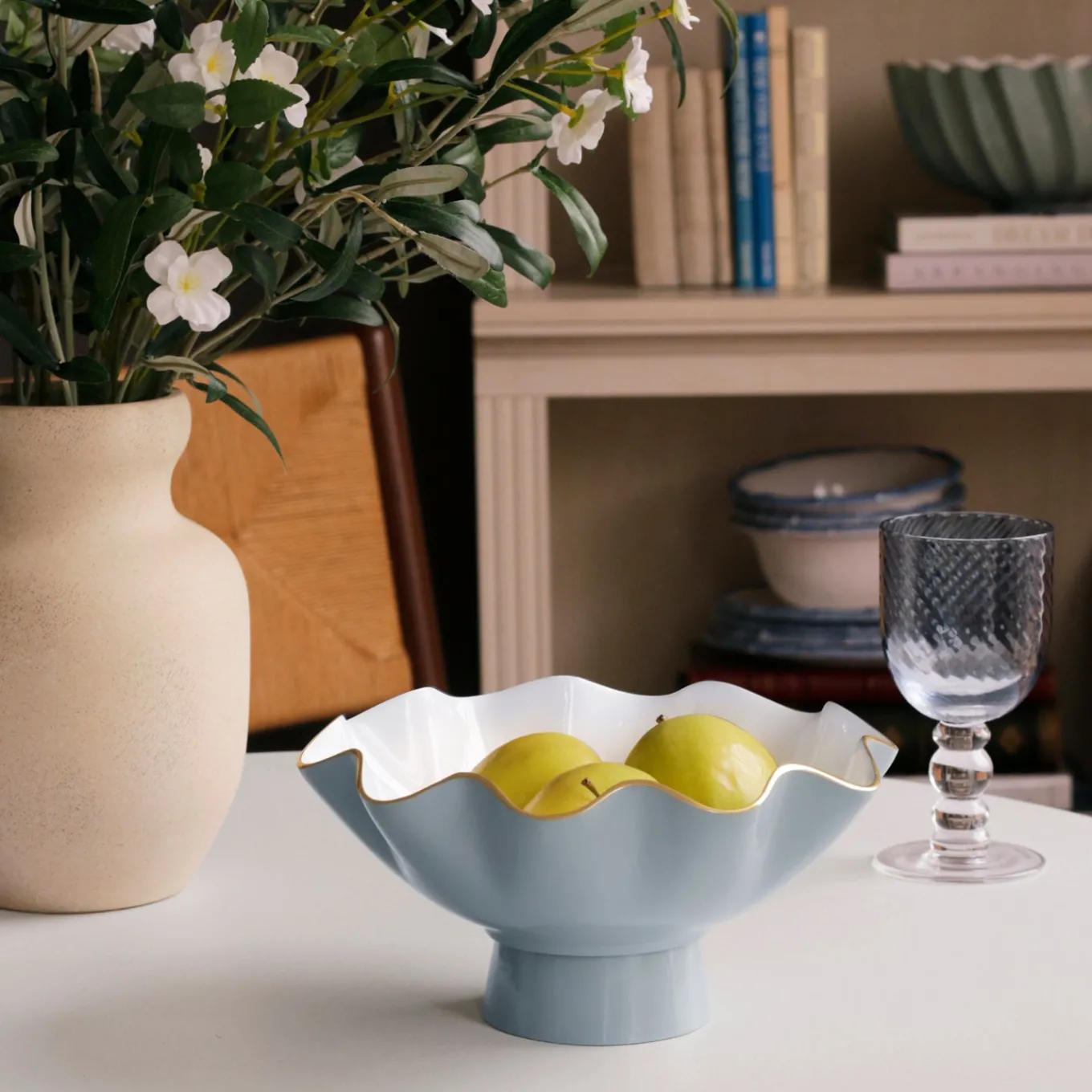 A cool classic in Slate and White. The ENCANTO Carola Small Pedestal (Slate and White) pairs timeless Vienna-inspired curves with a luminous two-tone enamel finish rimmed in gold. The Slate shade—a soft, slate-inflected neutral blue—adds depth and distinction, offering a modern interpretation of a timeless palette.