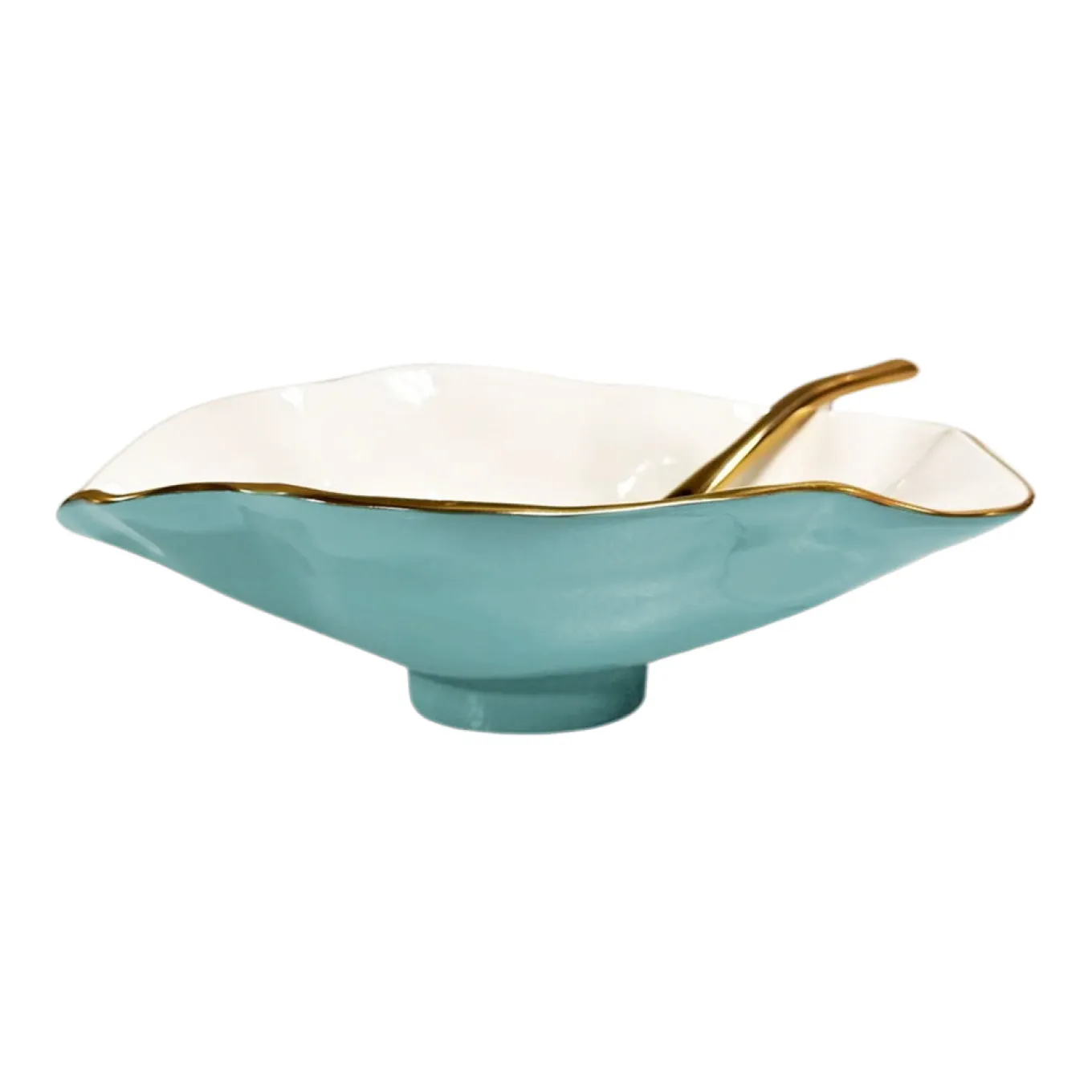 Spoon up something wonderful in the ENCANTO Claire Small Oval Bowl with Spoon (Turquoise, White and Gold) from Beatriz Ball! The sensational 2-part piece is notable for its generous shape, brilliant two-tone finish rimmed in gold and exuberant design; the accompanying spoon makes it an item that’s sure to delight. Great for serving salsa, sauces or sides, the bowl and spoon combo makes a dramatic statement wherever it is placed. ENCANTO pieces are fabulous gift items for brides, and perfect for anyone who loves to entertain or decorate. Beatriz Ball’s intensely handmade products use eco-friendly and sustainable materials and are crafted by artisans who trace a heritage of metalworking for generations. Made of a top quality, easy-care, aluminum alloy with a food safe enamel finish. Dishwasher safe.