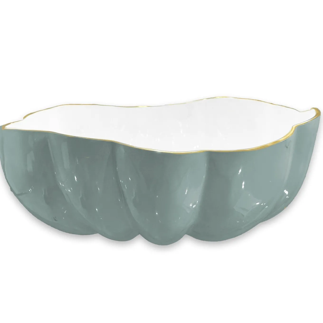 A one-of-a-kind shape, the ENCANTO Rita Large Bowl (Slate and White) pairs refined two-toned enamel with gold details. The Slate tone—a soft, slate-inflected blue—adds depth and distinction to displays, offering a modern interpretation of a timeless palette.