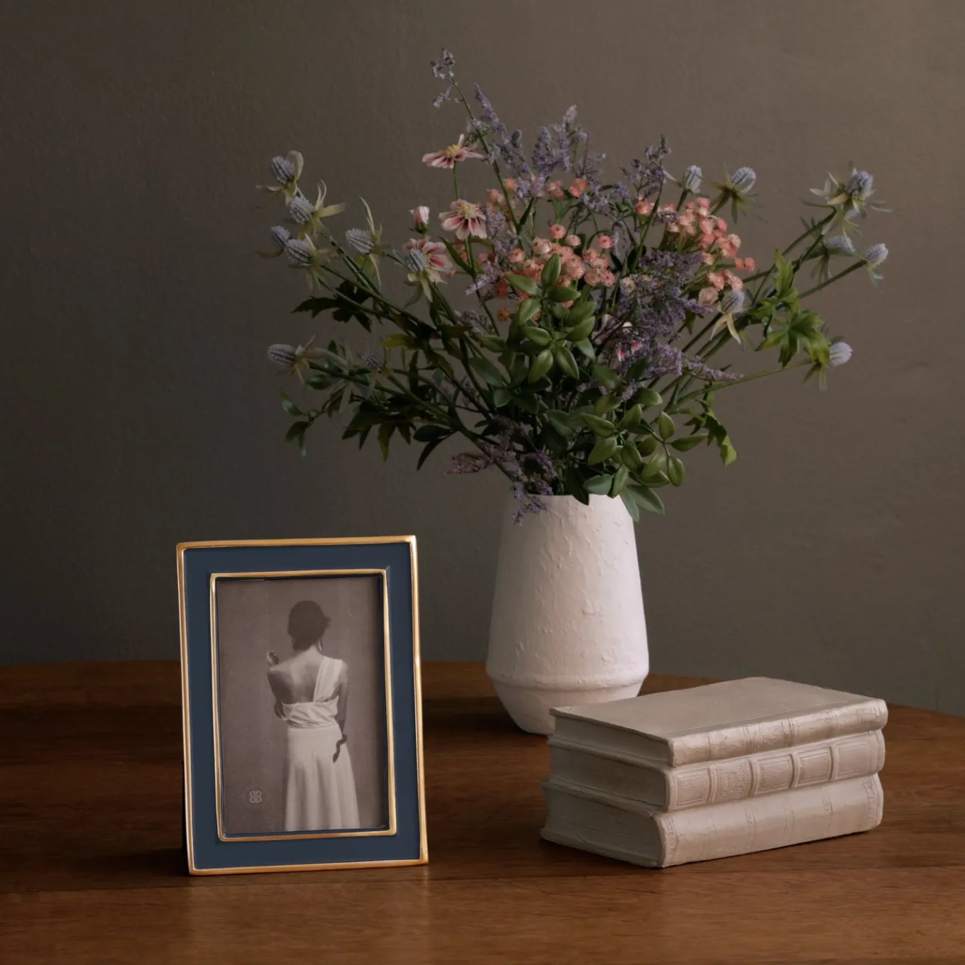 Impeccable design in Midnight. The Encanto Jason 4×6 Frame (Midnight) strikes a sophisticated note with its slim rectangular profile, luminous enamel finish rimmed in gold, and elegant proportions. The Midnight shade—a deep, rich blue—adds striking depth to any room.