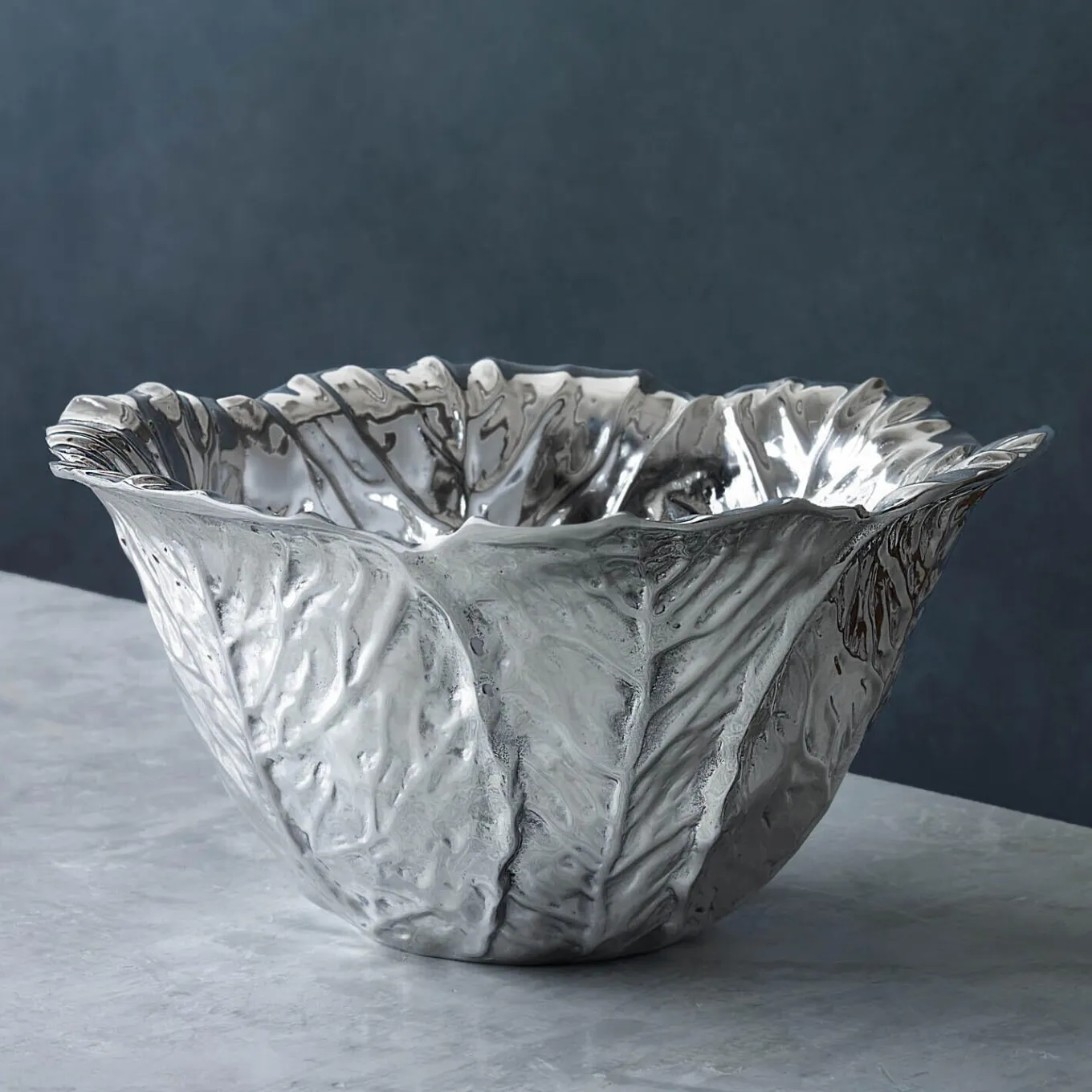 The Beatriz Ball GARDEN Cabbage large decorative silver bowl has deeply veined overlapping leaves, and is the perfect size for entertaining.