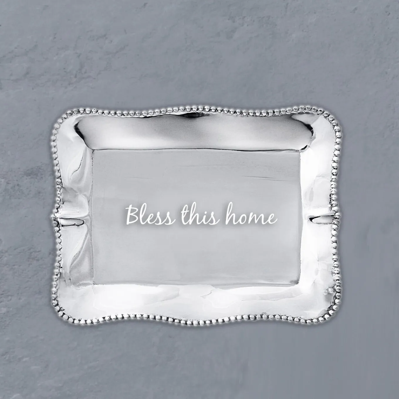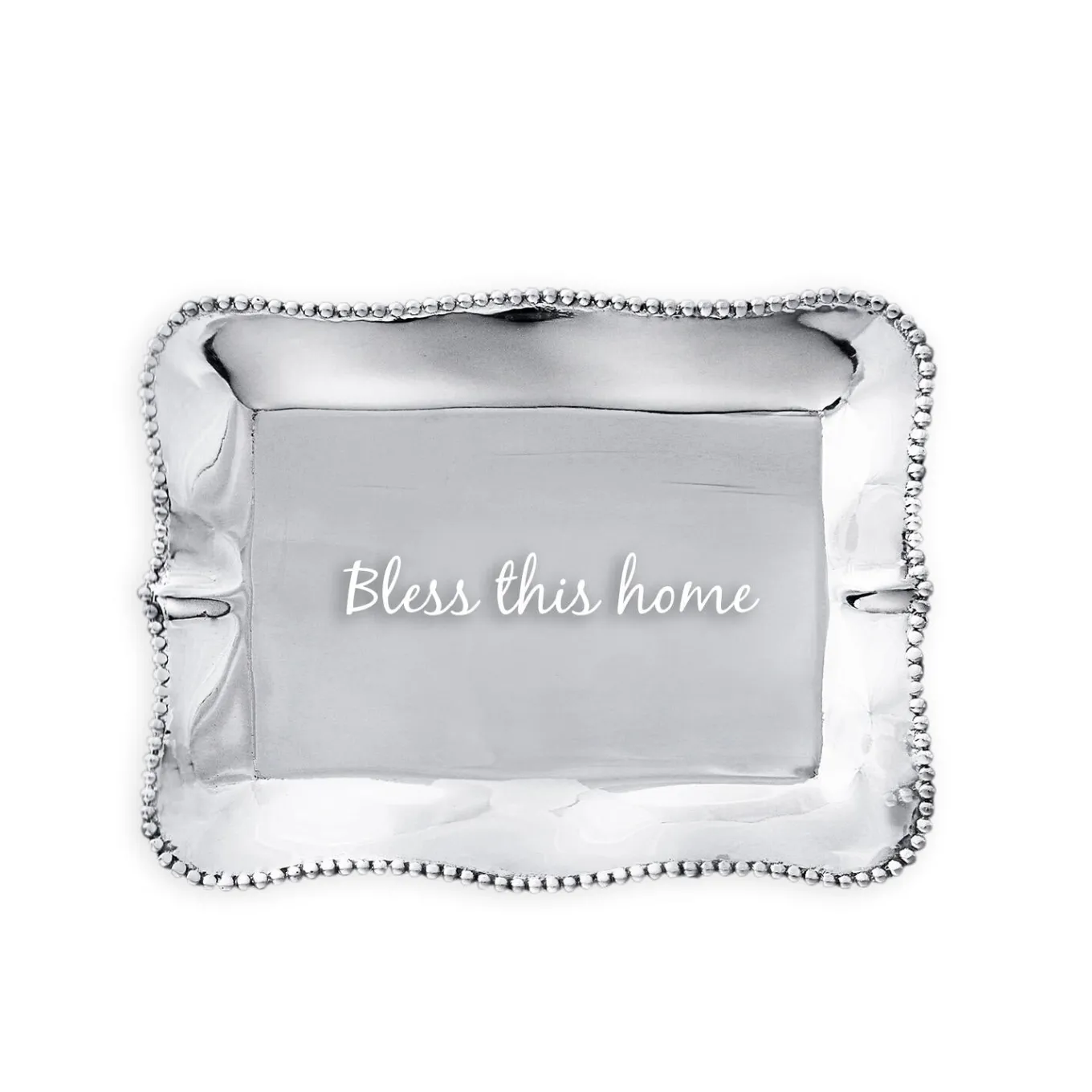 There’s no place like home. Keep the home fires burning with this lovely GIFTABLES Pearl Rectangular Engraved Tray from Beatriz Ball. Engraved with the slogan, “Bless this house,” this delightful mini tray is distinguished by its rich, hand finished surface, and practical size. Perfect on a desk, bedside table, or coffee table as a decorative accent. From our GIFTABLES Collection featuring handmade and artfully designed Beatriz Ball items at irresistible prices. Packaged in a handsome gift box, makes lovely present for the Holidays, birthdays, anniversaries, and other occasions. Handmade of an FDA safe, easy-care, oven and freezer friendly aluminum alloy. Tarnish free.