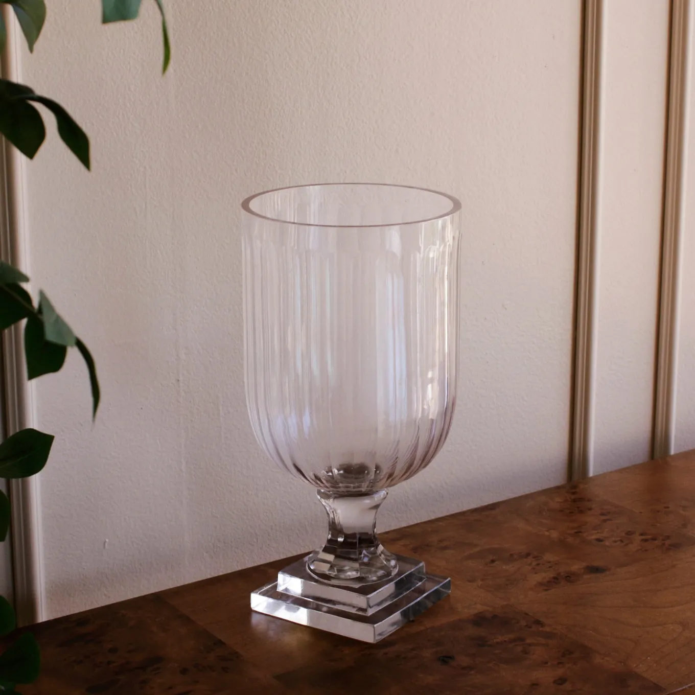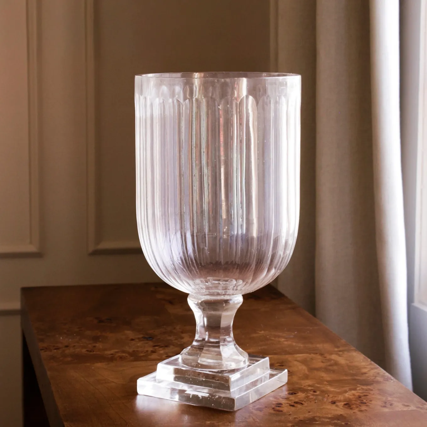 Pure simplicity with radiant appeal. The GLASS Eclat Large Hurricane in clear is hand-blown, showcasing elegant curves and timeless transparency. Stunning with a candle or floral arrangement, it adds effortless sophistication to any table, mantel, or console.