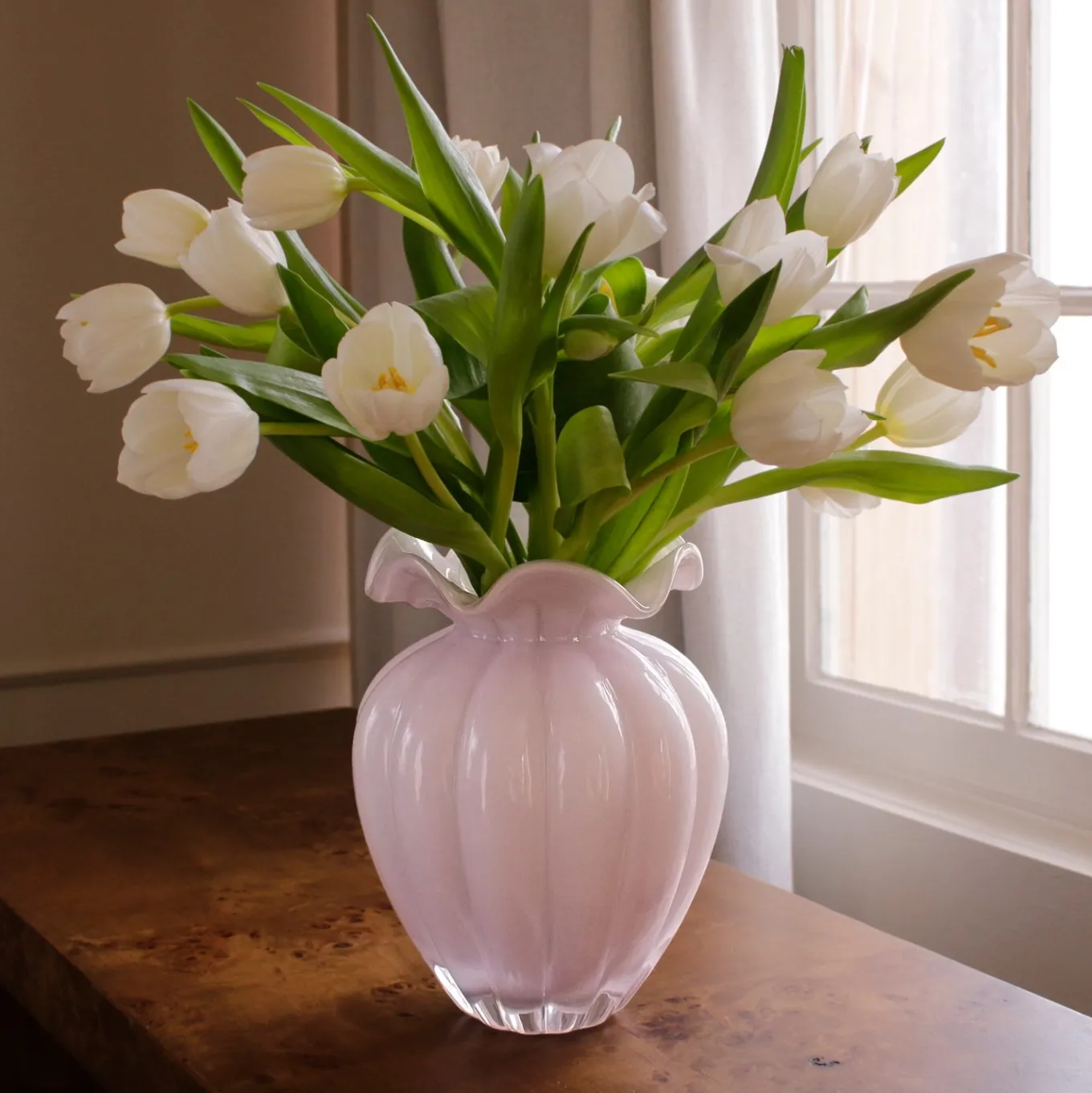 A soft blush accent for any setting. The GLASS Vento Large Vase in camellia showcases a graceful, curved profile and a romantic, pink-toned finish—perfect for showcasing fresh flowers, branches, or seasonal décor.