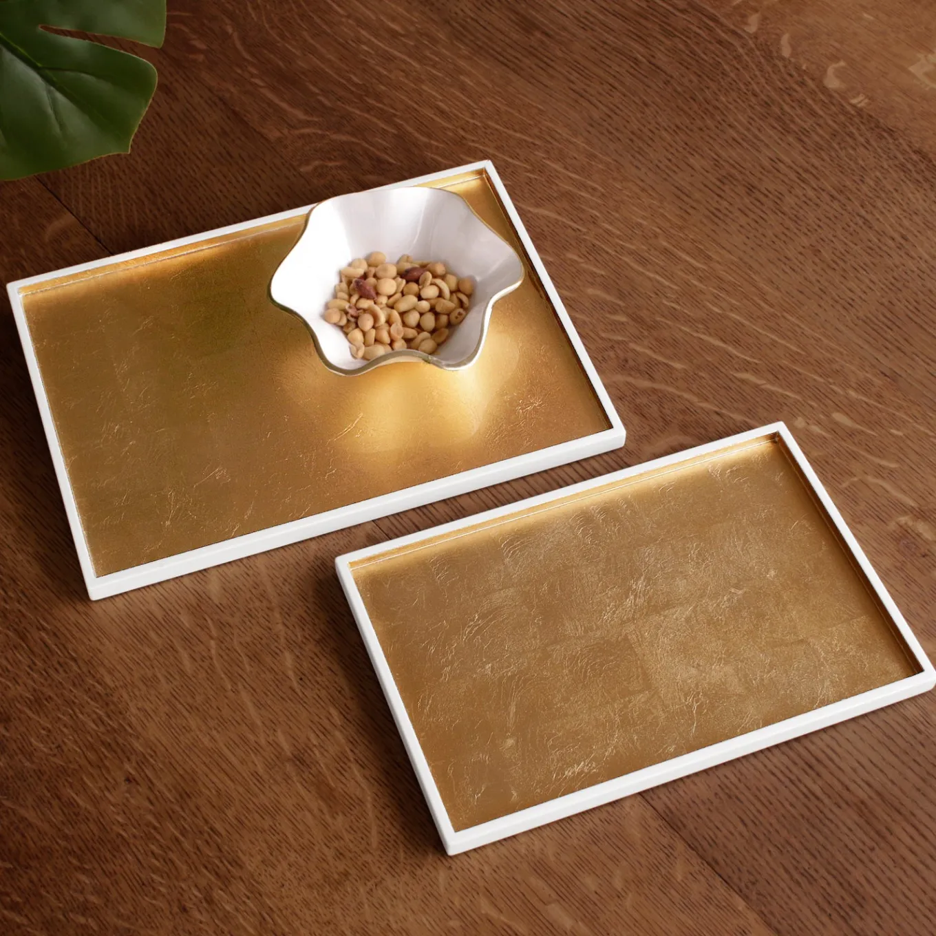 Elegant and endlessly useful. The INDOCHINE Rectangular Lacquered Trays in white & gold come as a set of two, each finished with a luminous lacquered surface and radiant palm motif. Perfect for serving cocktails, carrying snacks, or styling décor, they nest easily when not in use.