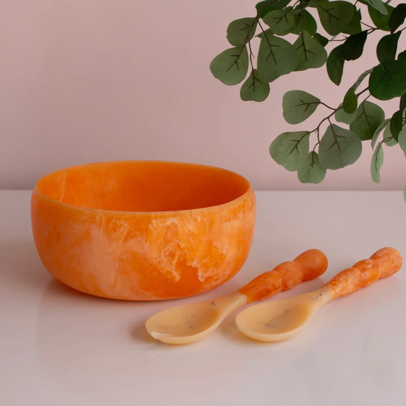 The Sorbet Collection’s Tangerine Large Round Bowl energizes your table with its vibrant orange swirled finish. Great for salads, chips, or casual entertaining, this piece is a fun statement-maker for any occasion.