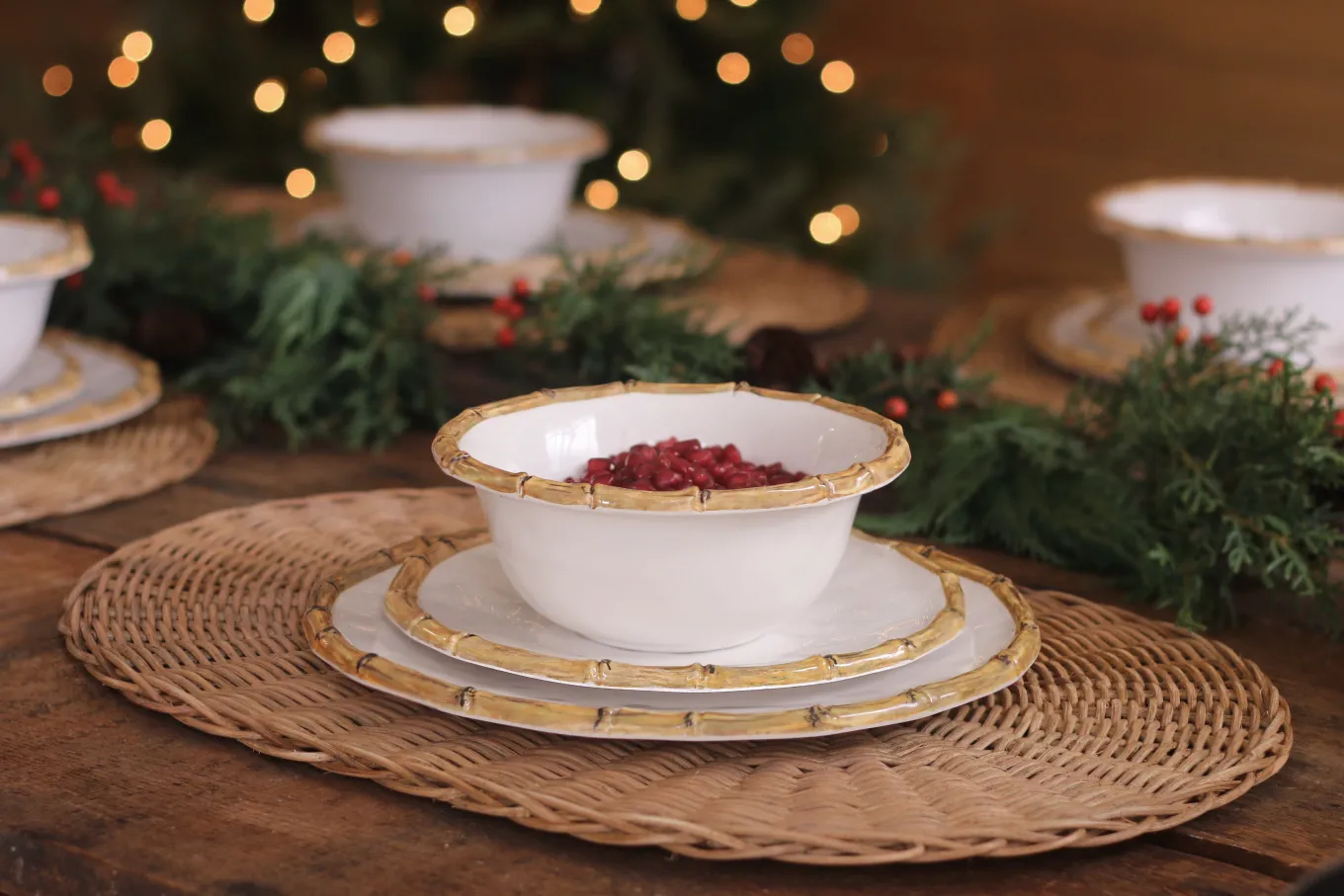 A table setting with a carefree, but classy, Beatriz Ball twist! The VIDA Bamboo 11″ Dinner Plate Set of 4 (White and Natural) looks great when sharing a table with Bamboo items from our signature metal line. We love it with our Bamboo flatware and August Wren’s “Happy Christmas” placemats, too. The plate has the luster, heft and look of a ceramic piece.