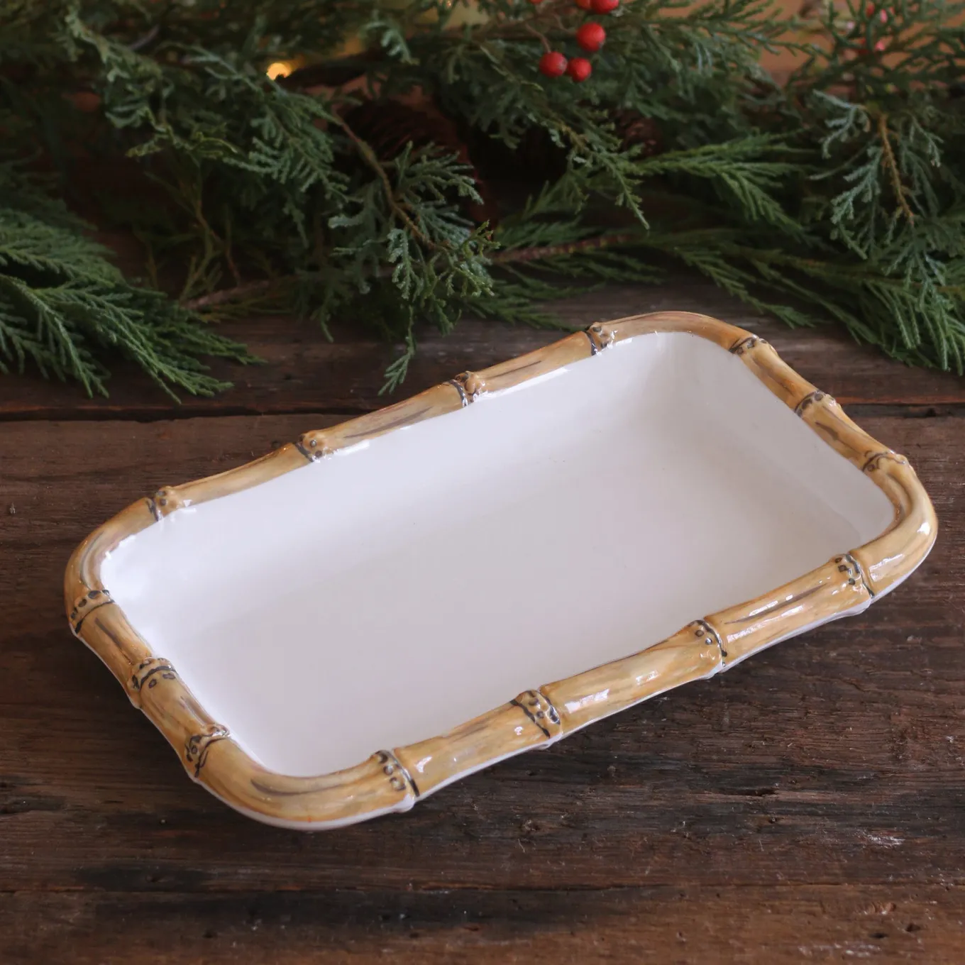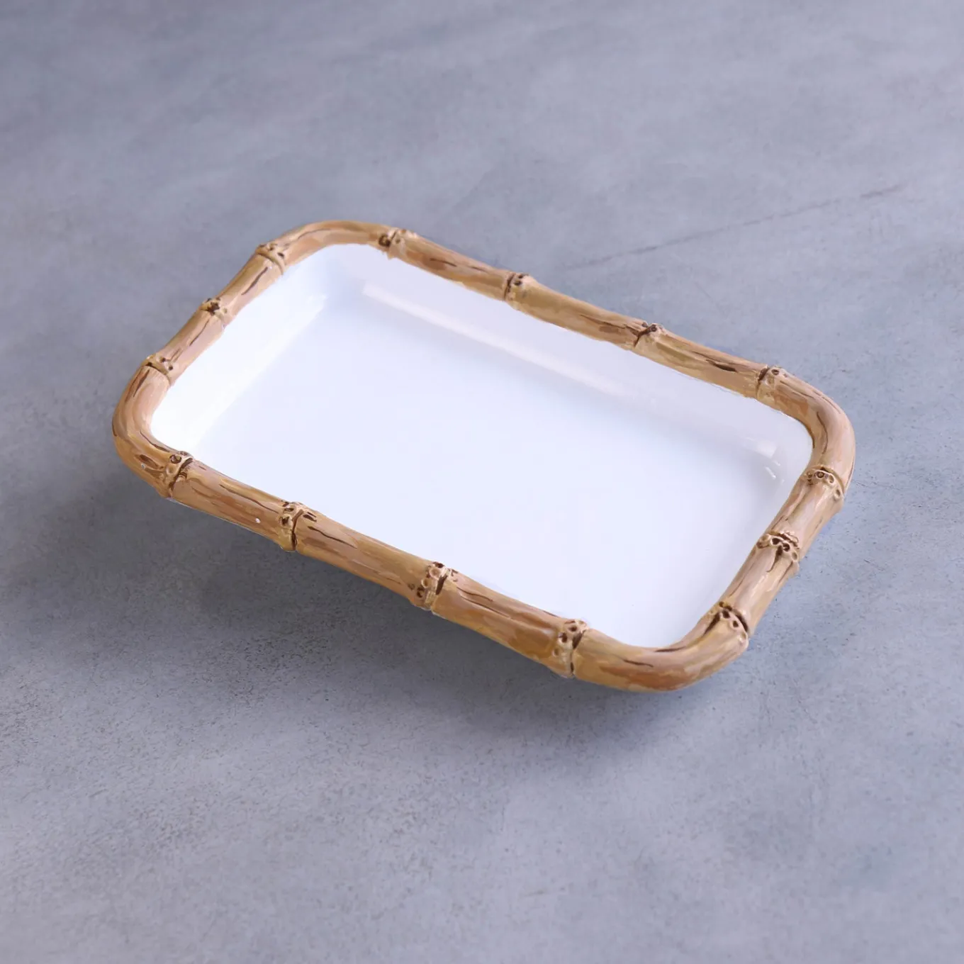 A flattering and classy look for guest towels. The VIDA Bamboo Beverage Napkin Holder (White and Natural), an essential serving piece from Beatriz Ball’s VIDA Collection of luxury melamine, is the result of a collaboration between the award-wining tabletop company and noted illustrator, August Wren. With a bamboo inspired rim and a brilliant white surface, the small rectangular tray looks great anywhere. Perfect for a variety of serving needs, the VIDA Bamboo Guest Towel Holder (White and Natural) has the luster, heft and look of a ceramic piece. Holds standard guest towels. Made of luxury melamine for everyday enjoyment, this piece is ideally suited for indoor and outdoor use. Dishwasher safe (top rack), heavy weight, food safe, BPA and PABA free.