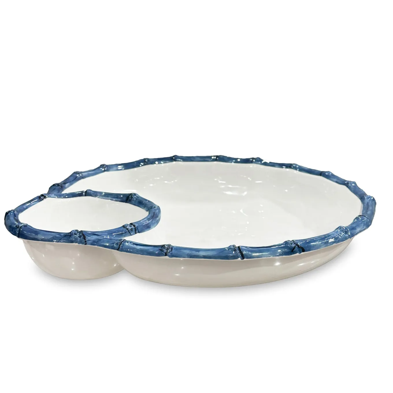 A fabulous chip & dip in timeless blue and white. The VIDA Bamboo Large Chip & Dip Bowl (White and Blue) combines a brilliant white surface with blue bamboo-inspired rims for a look that’s both carefree and classy. With two generous sections, it’s perfect for chips and dip, salsa, or veggies and dressing.