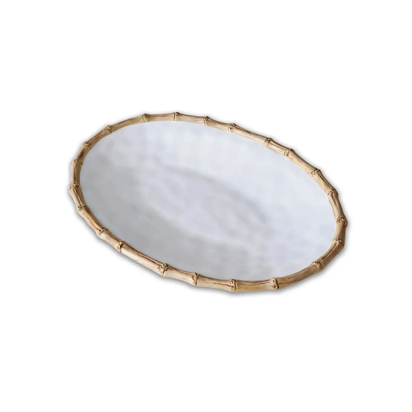 The VIDA Bamboo Large Oval Platter (White and Natural), an essential serving piece from Beatriz Ball’s VIDA Collection of luxury melamine, is the result of a collaboration between the award-wining tabletop company and noted illustrator, August Wren. With a bamboo inspired rim and a brilliant white surface, the generous oval platter works well with our VIDA Bamboo dining sets, serving pieces and flatware. Create a table with a carefree and classy Beatriz Ball twist! It looks great when sharing a table with GARDEN Bamboo items from our signature metal line too. Perfect for a variety of serving needs, the platter has the luster, heft and look of a ceramic piece.