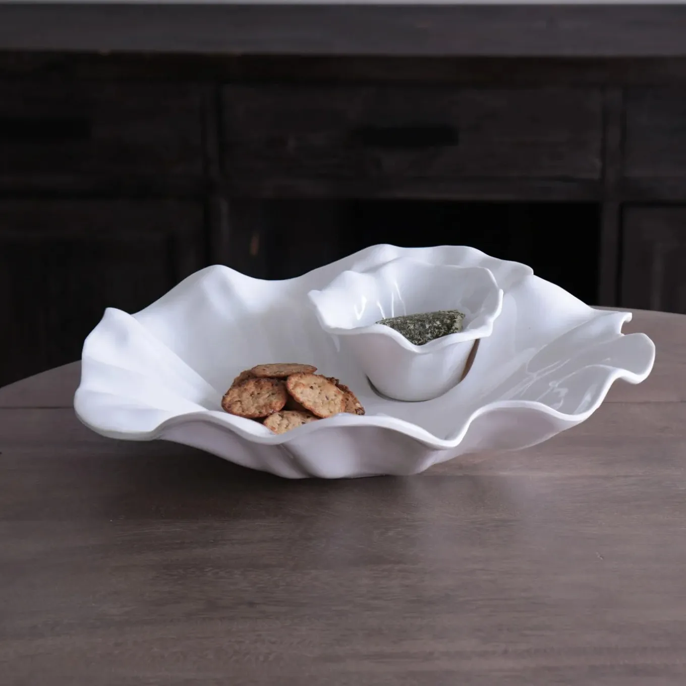 As with the other Bloom pieces, the dynamic design of the two-part VIDA Bloom Chip and Dip (White) in luxury melamine features rippling petal-like movement, creating an eye-catching serving piece that combines beauty, artistry and functionality. Great on its own, or combined with other Bloom shapes and sizes, this handsome chip and dip will be the life of the party.