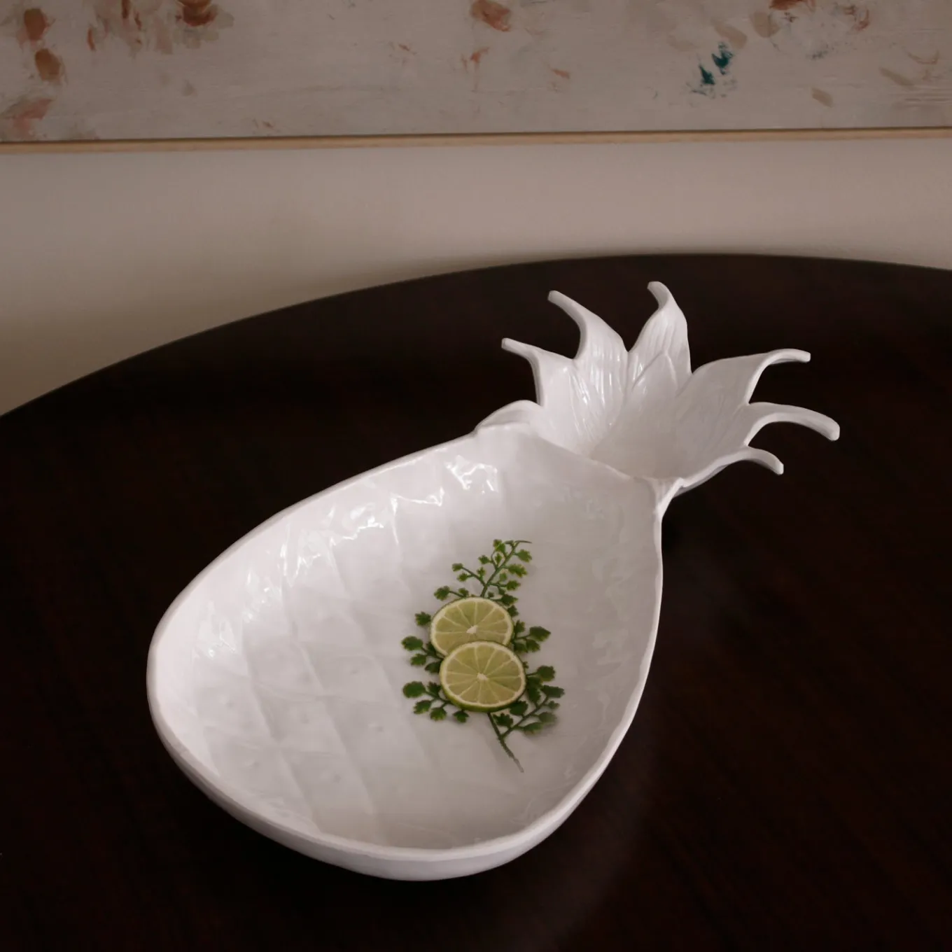 Welcome! This stunning piece has the substance, weight, and appearance of a ceramic item, but is made of luxury melamine for everyday enjoyment. A marriage of style and substance in a material made for today’s busy lifestyles, Beatriz Ball’s sculptural approach to melamine has truly revolutionized the category. The pineapple–the symbol of hospitality–makes a welcome appearance as two-chambered design by Beatriz Ball. With its sculptural form and richly detailed surface, the VIDA Lettuce Pineapple Chip & Dip (White) is both an accurate representation of the popular tropical fruit, and a practical serving piece. With its built-in dip bowl, this versatile item is ideal for serving fresh fruit, veggies, and crackers with your favorite dips and spreads. Makes a unique and welcome gift. The pieces are ideally suited for indoor and outdoor entertainment. Dishwasher safe, heavy weight, food safe, BPA and PABA free.