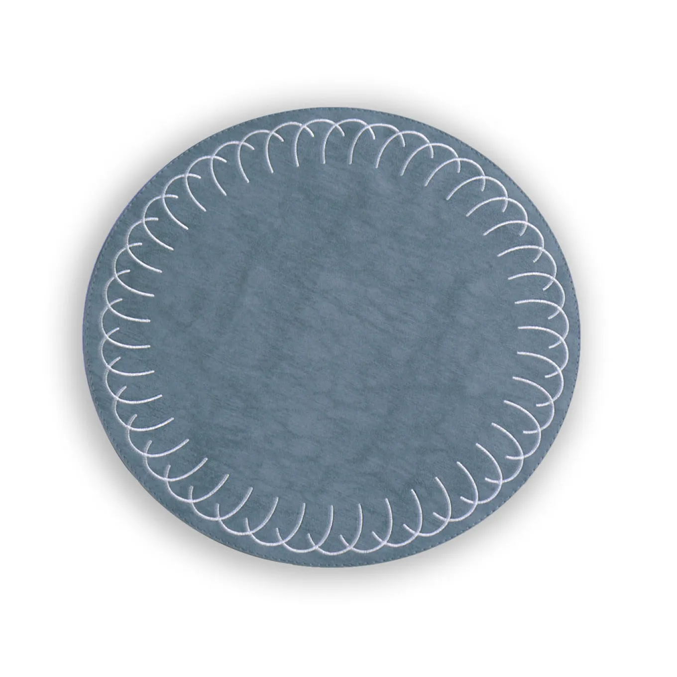 Easy care, easy style. The VIDA Round Embroidered Swirl 15.5″ Round Placemats Set of 4 (Blue) will give any table an instant makeover with joyful color and lively swirling patterns.
