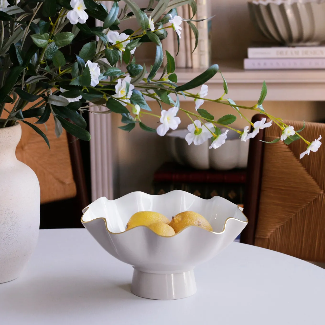 A delicate Dove hue brings calm elegance. The ENCANTO Carola Small Pedestal (Dove and White) delights with flirty curves, a brilliant enamel finish rimmed in gold, and a graceful sculptural base. The Dove shade—a soft neutral gray with subtle undertones—offers versatile sophistication that complements any table or décor.