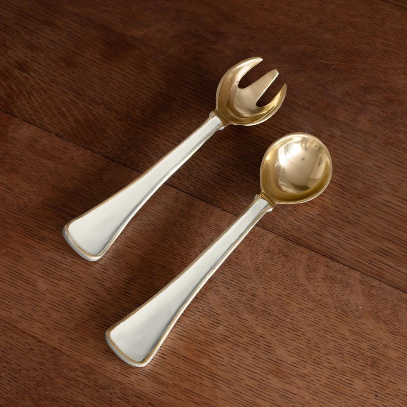 The sensational ENCANTO Soho Salad Servers (Cream) in a cream tone with gold details is a shining example. Fabulous servers to add a touch of glam to any table. Food- and dishwasher-safe, the sparkling set adds a modern new dimension to Beatriz Ball’s award-winning designs. Combine with other ENCANTO pieces for a sensational set. Fabulous gift items for brides, and perfect for anyone who loves to entertain. Beatriz Ball’s intensely handmade products use eco-friendly and sustainable materials and are crafted by artisans who trace a heritage of metalworking for generations. Made of a top quality, easy-care, aluminum alloy with a food safe enamel finish. Dishwasher safe.