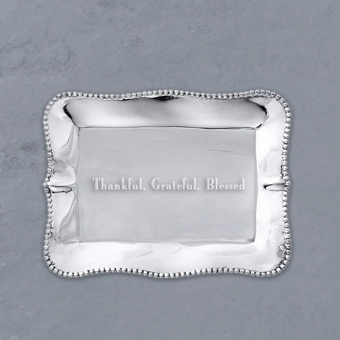 Gratitude. Express your feelings with this lovely GIFTABLES Pearl Rectangular Engraved Tray from Beatriz Ball. Engraved with the slogan, “Thankful, Grateful, Blessed,” this delightful mini tray is distinguished by its rich, hand finished surface, and practical size. Perfect on a desk, bedside table, or coffee table as a decorative accent. From our GIFTABLES Collection featuring handmade and artfully designed Beatriz Ball items at irresistible prices. Packaged in a lovely gift box, makes lovely present for the Holidays, birthdays, anniversaries, and other occasions. Handmade of an FDA safe, easy-care, oven and freezer friendly aluminum alloy. Tarnish free.