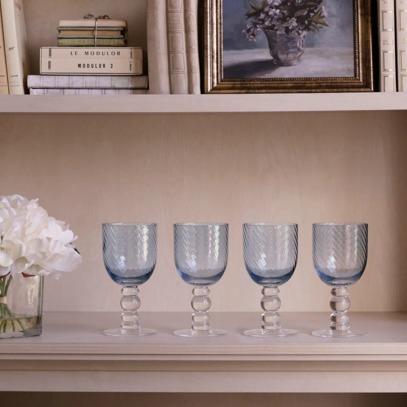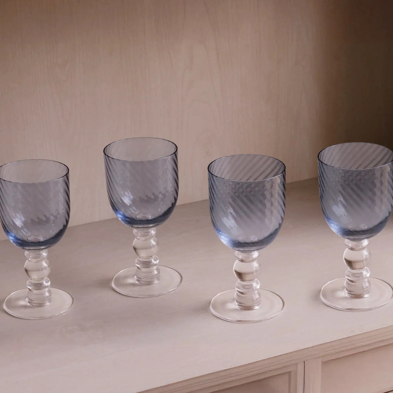 A sparkling glass in a beautiful blue hue! The elegant French Swirl Wine glasses in a et of 4 (Blue) brings timeless sophistication to the table. Featuring a swirl optic on the bowl and decorative curves on the stem, the design creates a dazzling interplay of light and texture.