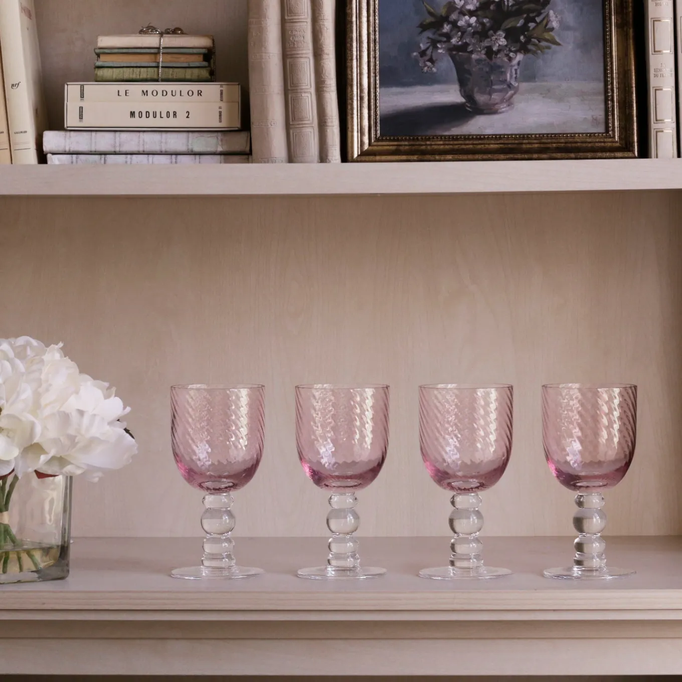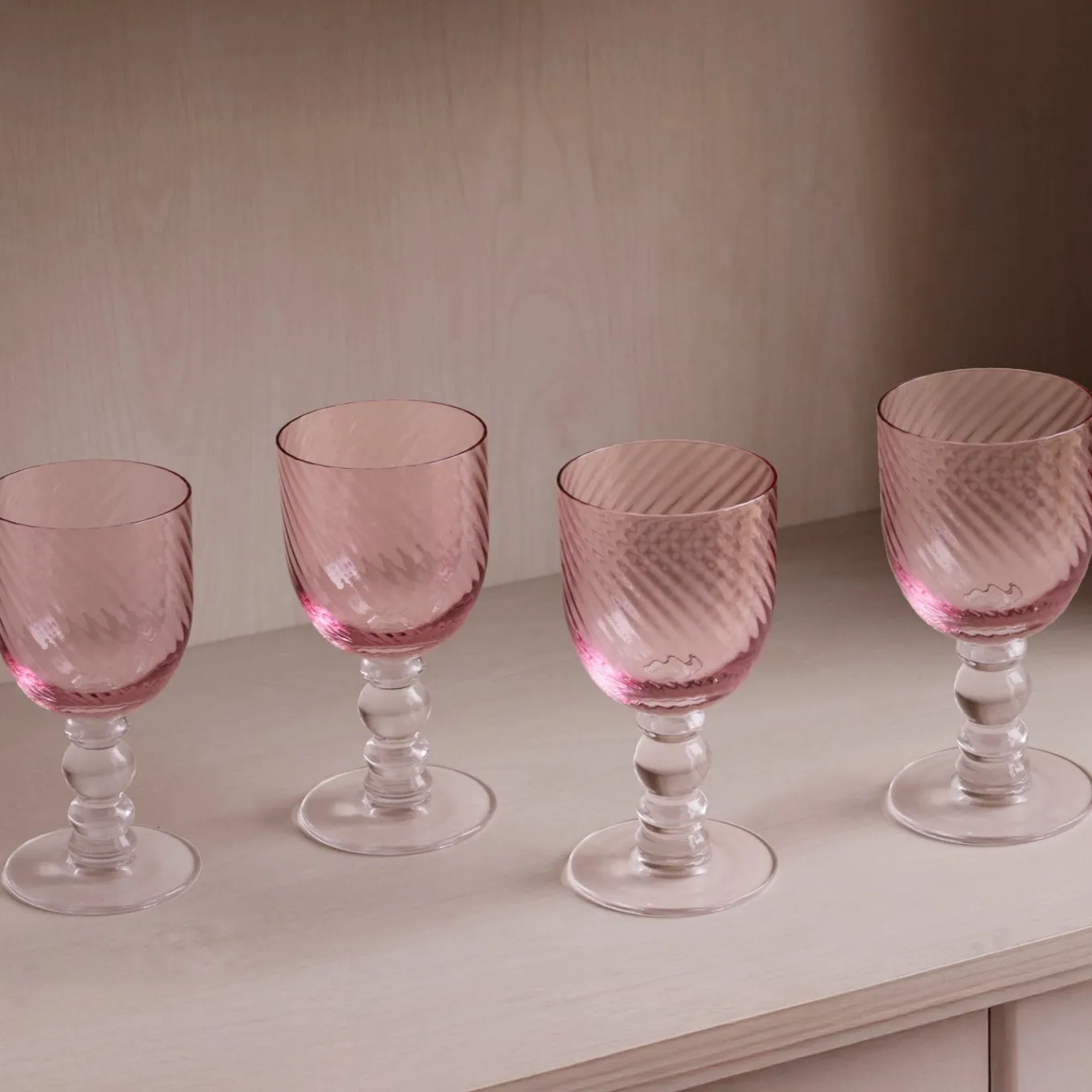 A sparkling glass in a lovely shade of pink! The elegant GLASS French Swirl Wineglasses in a set of 4 (Pink) captures light with a swirl optic bowl and decorative curves on the stem, creating graceful reflections.
