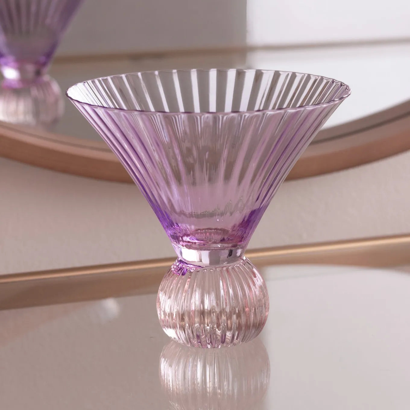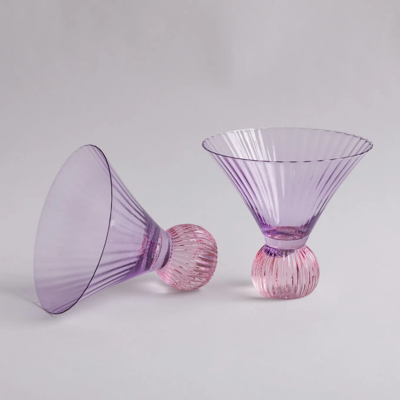 Straight up! Beautifully fluted, featuring lustrous colors and a spherical base, our GLASS Venice Martini Set of 4 (Violet and Pink) adds sparkle to any tablescape. Hand painted glass with a watercolor luster and brilliance enhances any sip. Made exclusively for Beatriz Ball. Hand wash with soft sponge and mild detergent using lukewarm water; wipe dry with soft cloth.