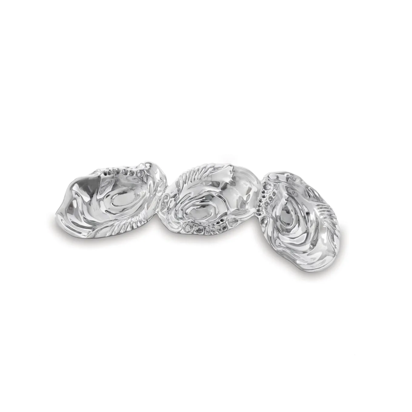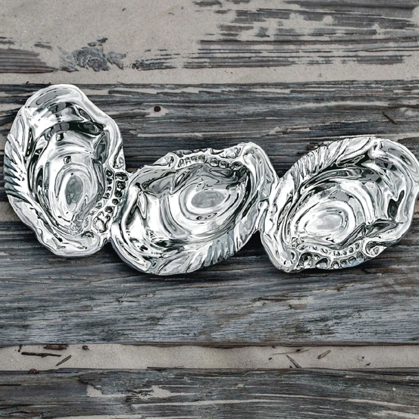 The OCEAN Triple Oyster Dip is composed of three linked oyster shells, artfully rendered in a gleaming, sand-cast metal.