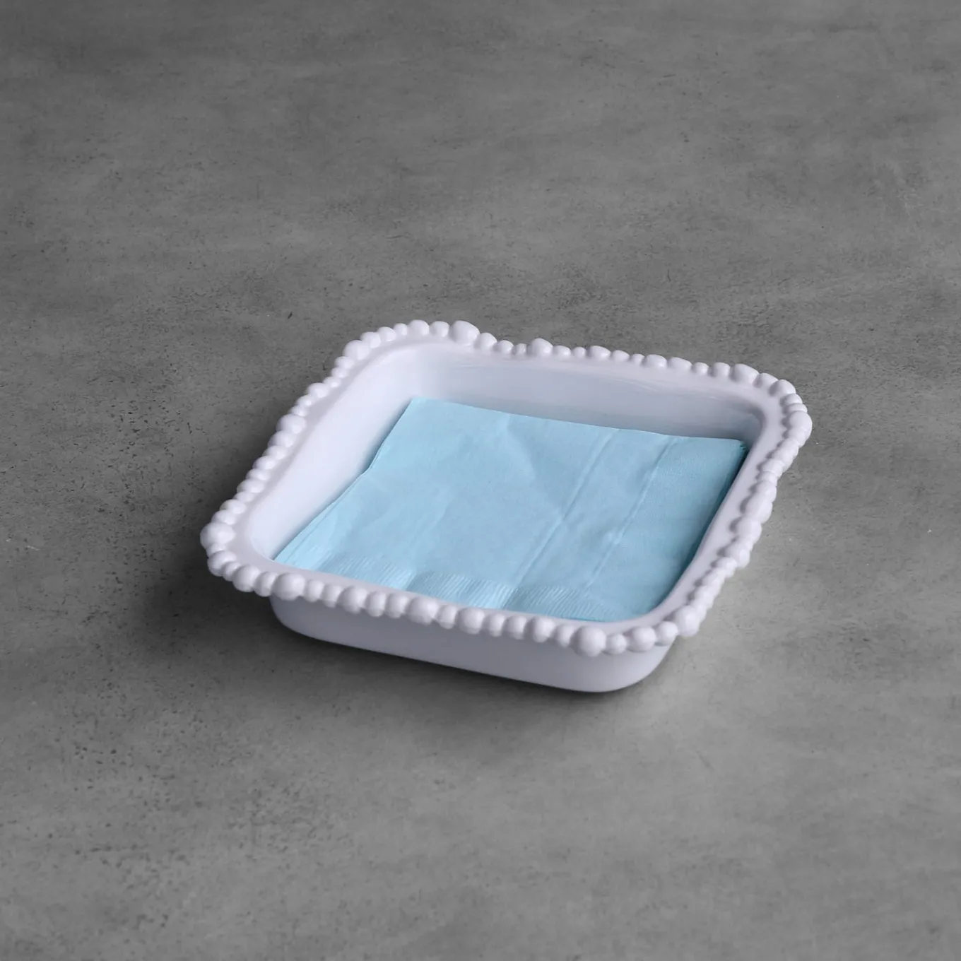 Composed of luxury melamine and designed in inimitable Beatriz Ball style, our VIDA Alegria Beverage Napkin Holder (White) is a perfect choice for presenting paper napkins or linen coasters at the bar but can also be used for a variety of other purposes. Employ it for serving snacks, as a candy dish, or as a handsome catch-all on the desk or vanity. With the substance, weight and appearance of ceramics, the VIDA line of luxury melamine is designed for everyday enjoyment, and this versatile white piece is ideally suited for indoor and outdoor entertainment. Blends beautifully with any items from Beatriz Ball’s signature metal line. Makes an unforgettable hostess gift. Dishwasher safe (top rack), heavy-weight, food safe, BPA and PABA free.