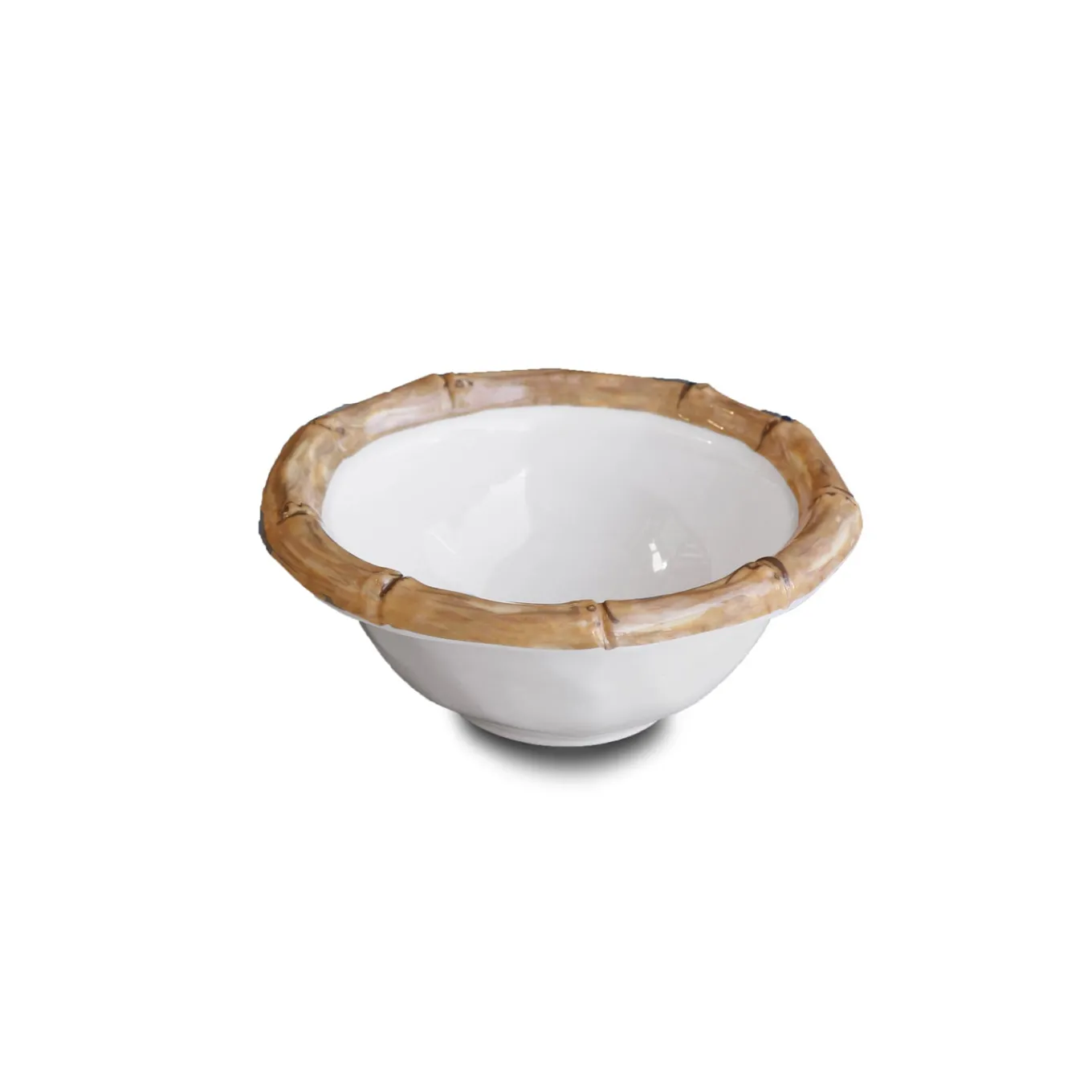 Smaller than our “small” dip bowl; presenting a versatile mini dip bowl in classic Bamboo style! The VIDA Bamboo Mini Dip Bowl (White and Natural), an essential serving piece from Beatriz Ball’s VIDA Collection of luxury melamine, is the result of a collaboration between the award-wining tabletop company and noted illustrator, August Wren. With a bamboo inspired rim and a brilliant white surface, the bowl works well with our VIDA Bamboo dining sets, serving pieces and flatware. Pair with any of our larger Bamboo platters or bowls for a great chip and dip set. Create a table with a carefree and classy Beatriz Ball twist! It looks great when sharing a table with GARDEN Bamboo items from our signature metal line too. Perfect for a variety of serving needs, the mini dip bowl has the luster, heft and look of a ceramic piece. Made of luxury melamine for everyday enjoyment, this piece is ideally suited for indoor and outdoor entertainment. Dishwasher safe (top rack), heavy weight, food safe, BPA and PABA free.