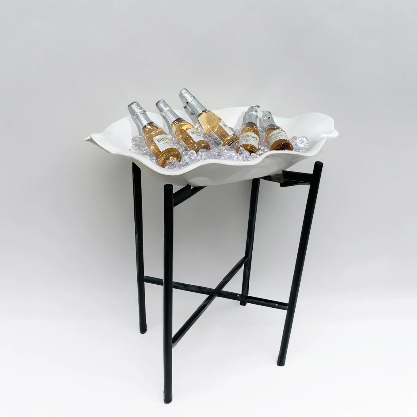All rise! Our VIDA Nube Extra Large Oval Centerpiece (White) floats like a cloud when placed on the towering VIDA Metal Stand for Extra Large Centerpiece. With a rubberized material to hold the centerpiece in place, the black powder coated stand adds a sleek and modern touch to the iced beverages presentation. The modern black finish is so adaptable, fitting into many different types of environments. Composed of powder coated metal. Some assembly required. Hand wash.