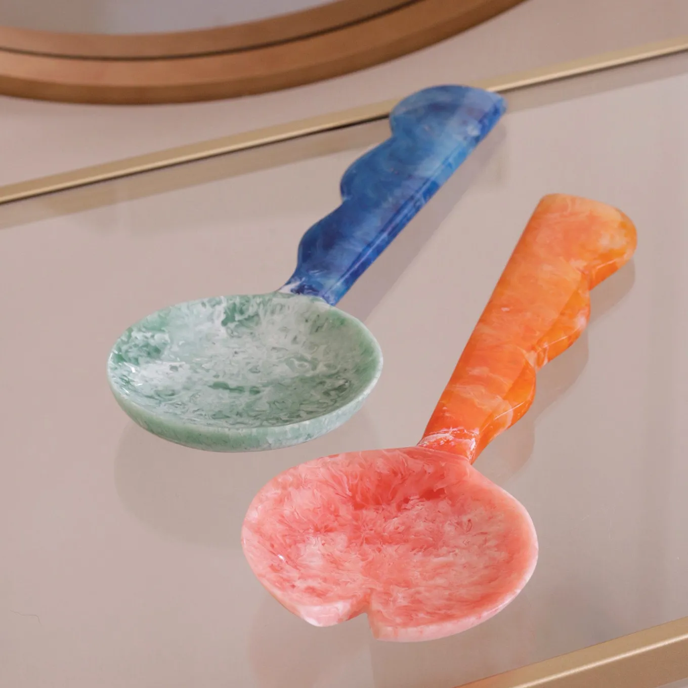 Uniquely beautiful. The lively, swirling surfaces of these paddle-shaped resin salad servers are one-of-a-kind. Each piece is individually hand-poured ensuring that no two pieces will ever be same. Artfully elegant, the servers are comfortable to grasp, and ideal for tossing and serving salads and pasta dishes. Beautifully designed, they add vivid colors to the table. Great for indoor and outdoor entertaining. Comes in a handsome gift box. Composed of top-quality, BPA-free resin. Hand wash only.